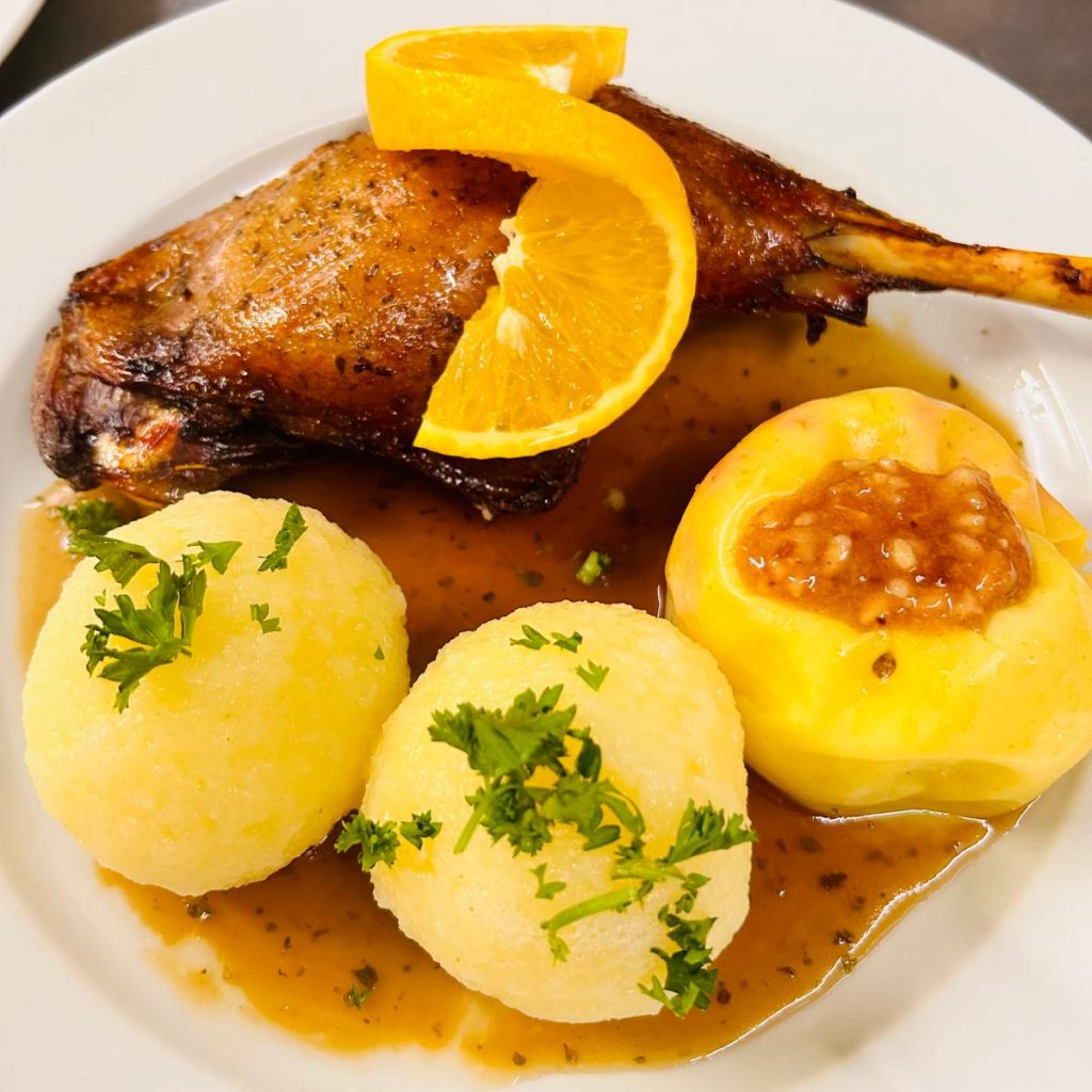 Der Duft von knusprig gebratener Gänsekeule zieht wieder durch unsere Küche – zart, saftig und einfach unwiderstehlich! Ab November servieren wir Ihnen wieder unsere traditionelle Gänsekeule mit hausgemachtem Rotkohl, fluffigen Klößen und einem karamellisierten Bratapfel – ein Festessen, das Herz und Gaumen wärmt.